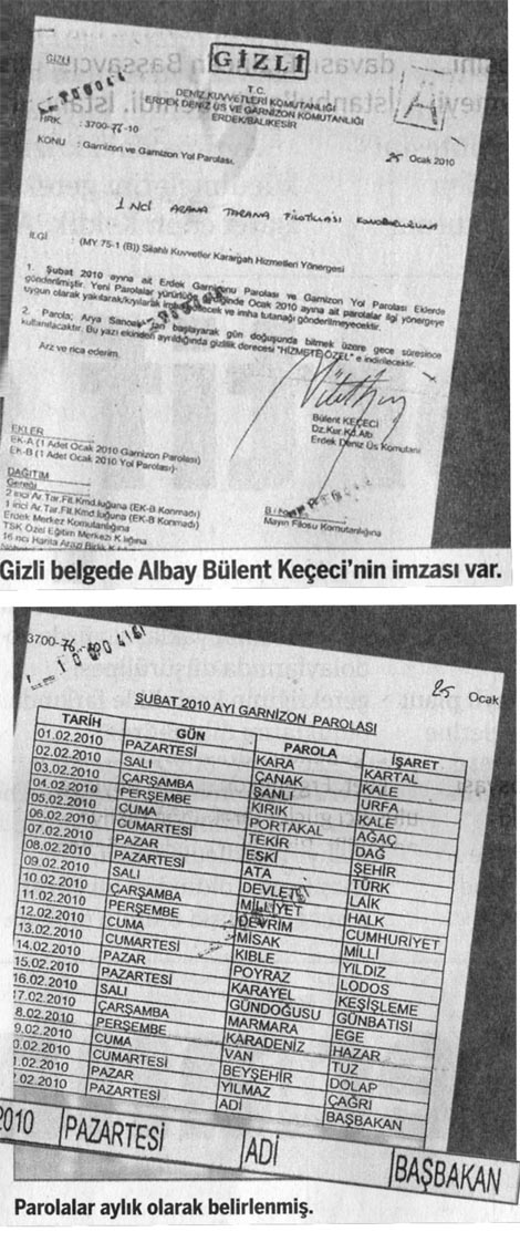 Taraf gazetesi, Erdek Deniz Üs Komutanı Kurmay Kıdemli Albay Bülent Keçeci' nin 25 Ocak 2010 tarihinde imzaladığı yönergeye göre, 22 Şubat 2010 için kararlaştırılan garnizon parolasının "ADİ", işaretinin ise "BAŞBAKAN" olduğunu iddia etti.